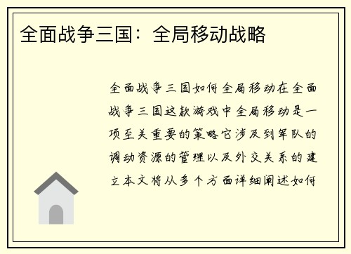 全面战争三国如何全局移动 在《全面战争三国》这款游戏中,全局移动是一项至关重要的策略,它涉及到军队的调动、资源的管理以及外交关系的建立。本文将从多个方面详细阐述如何进行全局移动,帮助玩家制定合理的战略。 1. 军队调动 军队调动是全局移动的核心内容之一。玩家需要根据地图上的情况和自己的战略目标,合理...